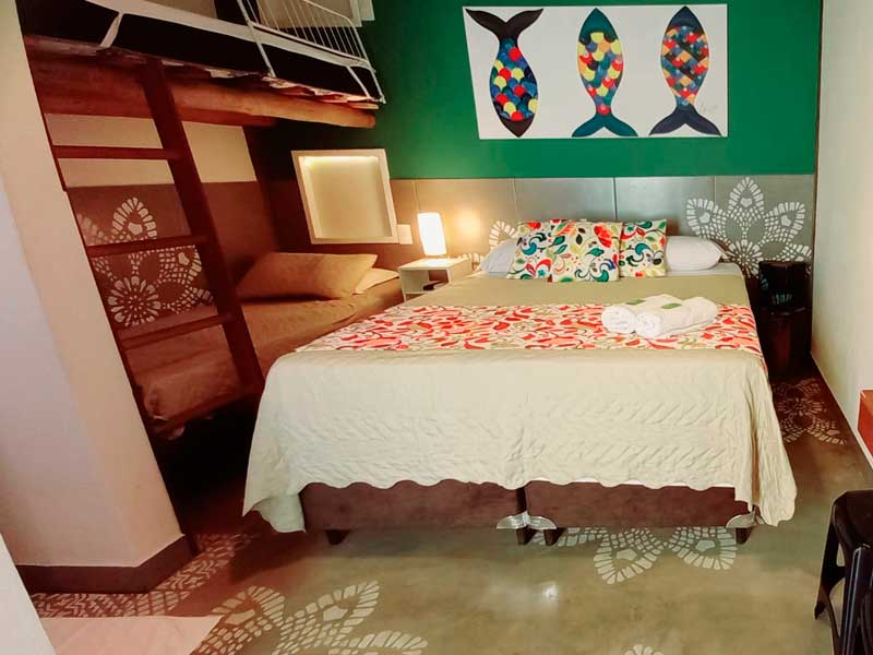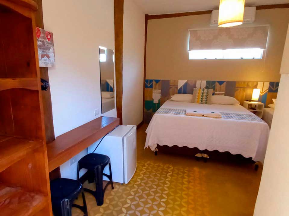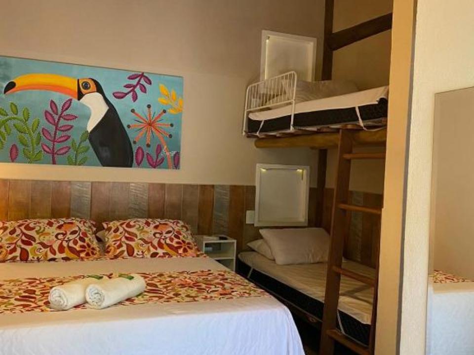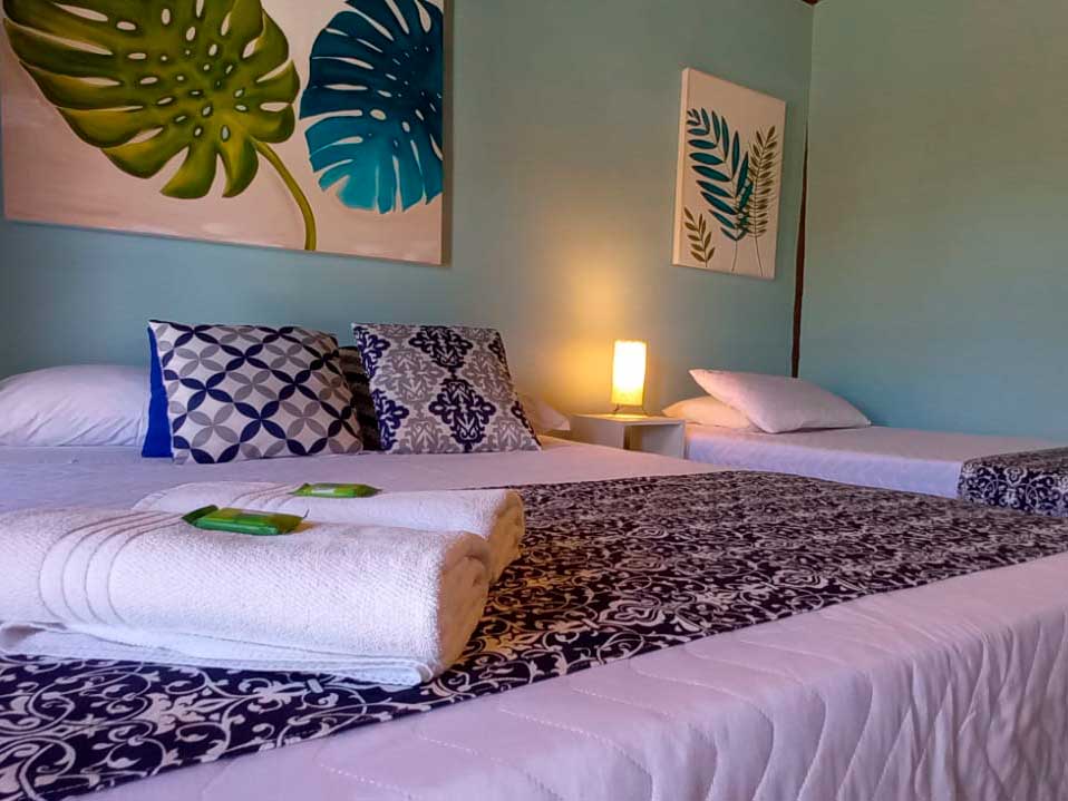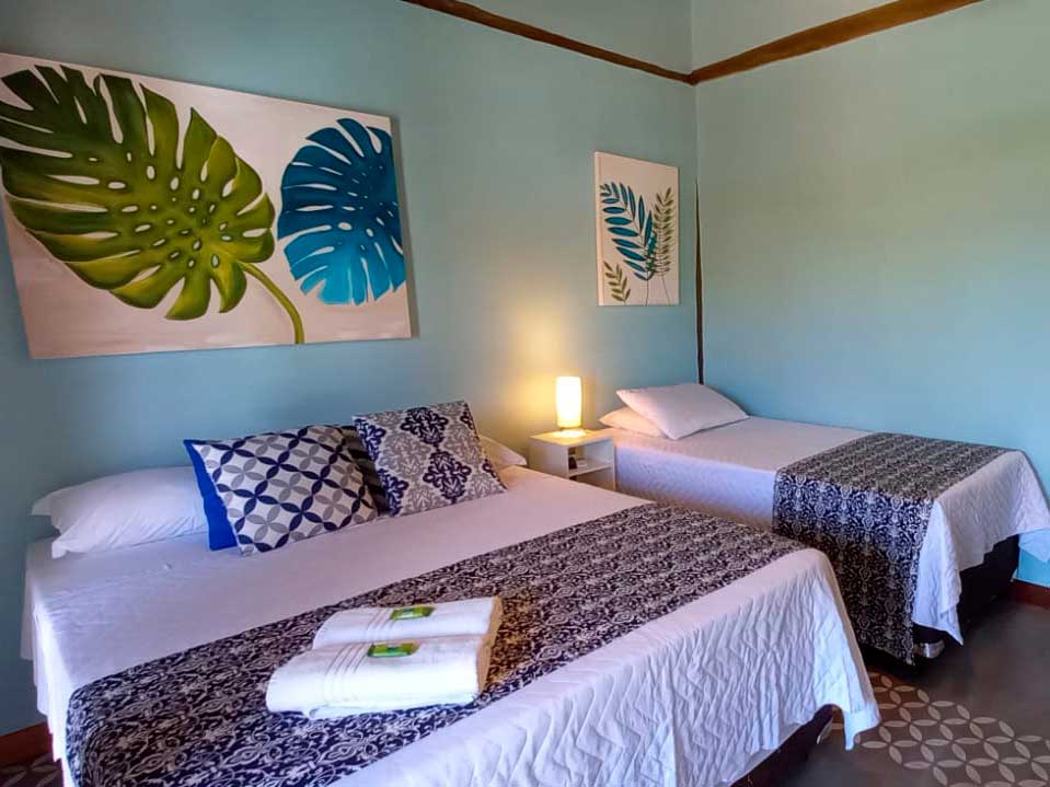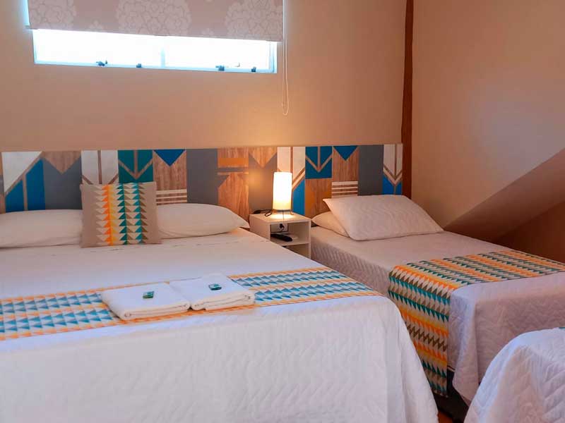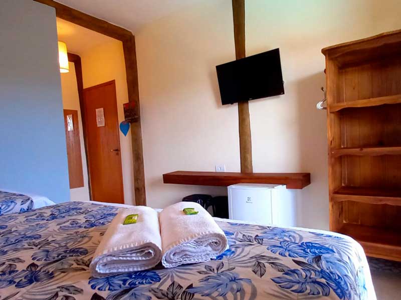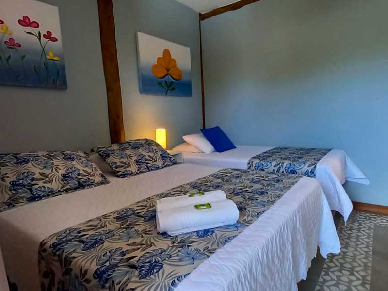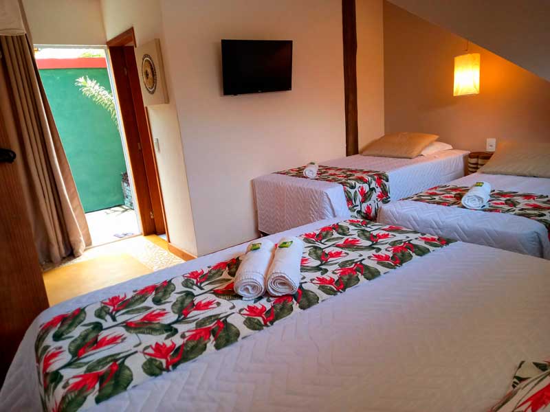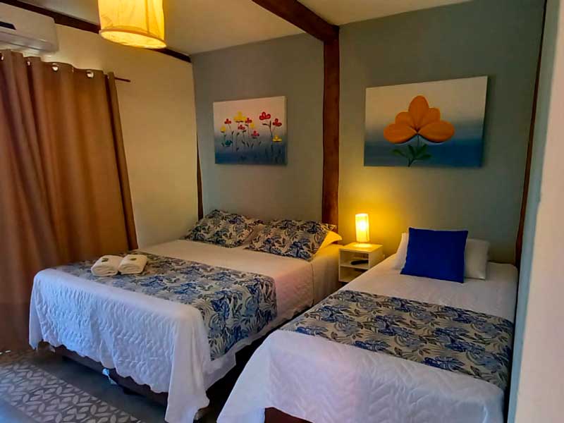 Suíte Familiar no piso térreo, o destaque desta suíte é o tamanho, ela é mais ampla que as outras e recebe crianças de todas as idades. Suíte com 1 cama de casal Queen Size, 2 camas de solteiro e uma cama auxiliar. A suíte está equipada com Ar condicionado Split Armário, Frigobar, Tv led e Varal. A suíte foi projetada para acomodar até 5 hóspedes.
