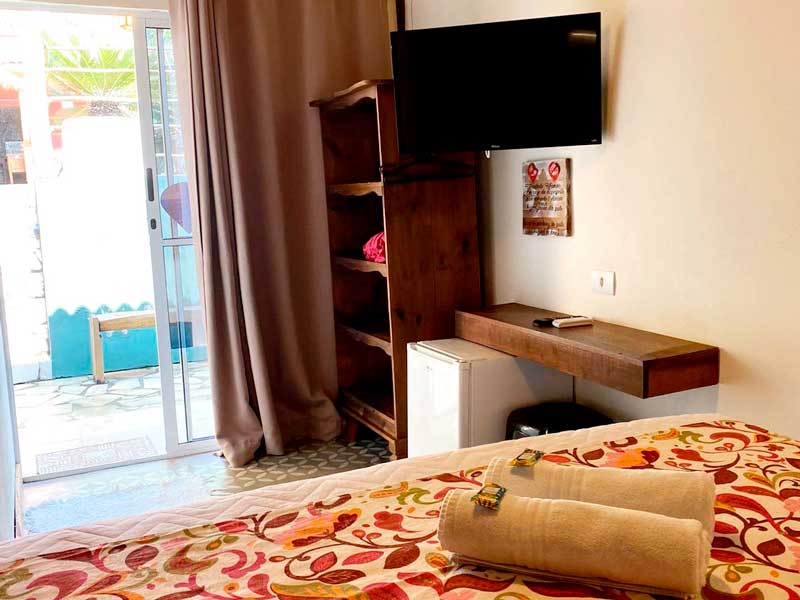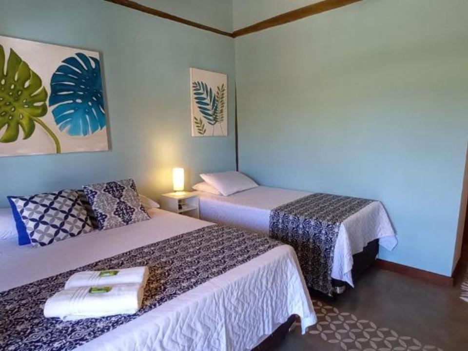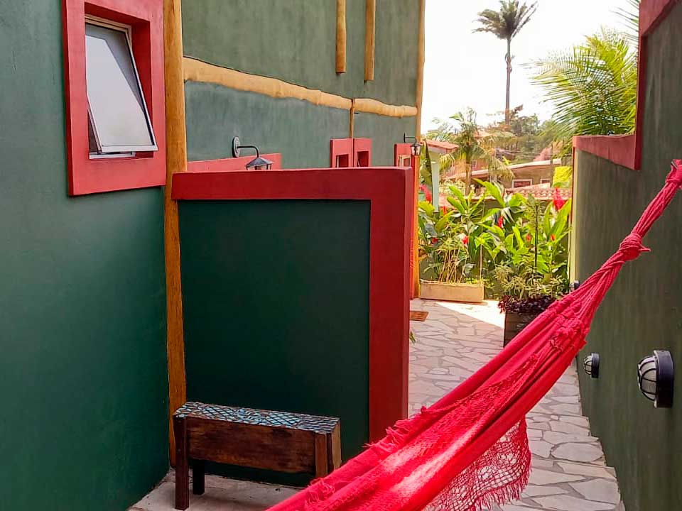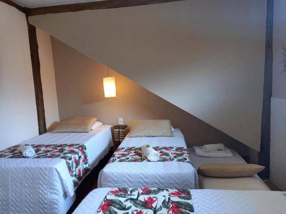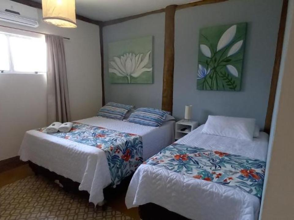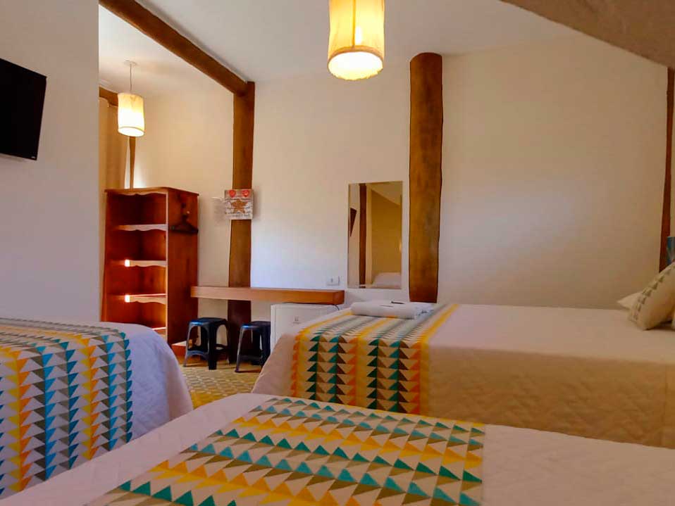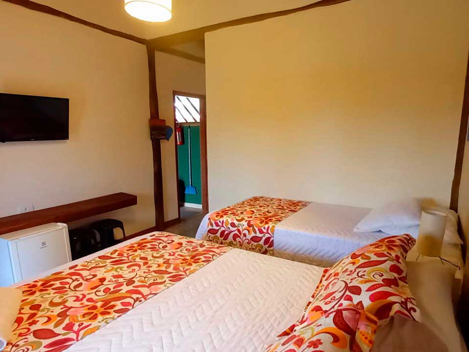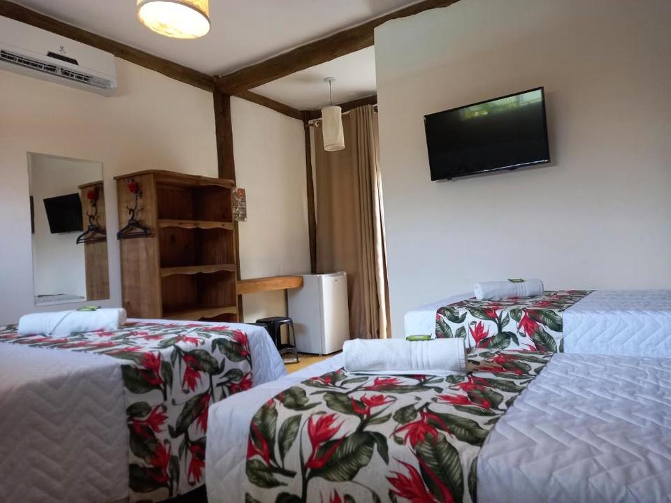 Suíte Familiar no piso térreo, o destaque desta suíte é o tamanho, ela é mais ampla que as outras e recebe crianças de todas as idades. Suíte com 1 cama de casal Queen Size, 2 camas de solteiro e uma cama auxiliar. A suíte está equipada com Ar condicionado Split Armário, Frigobar, Tv led e Varal. A suíte foi projetada para acomodar até 5 hóspedes.