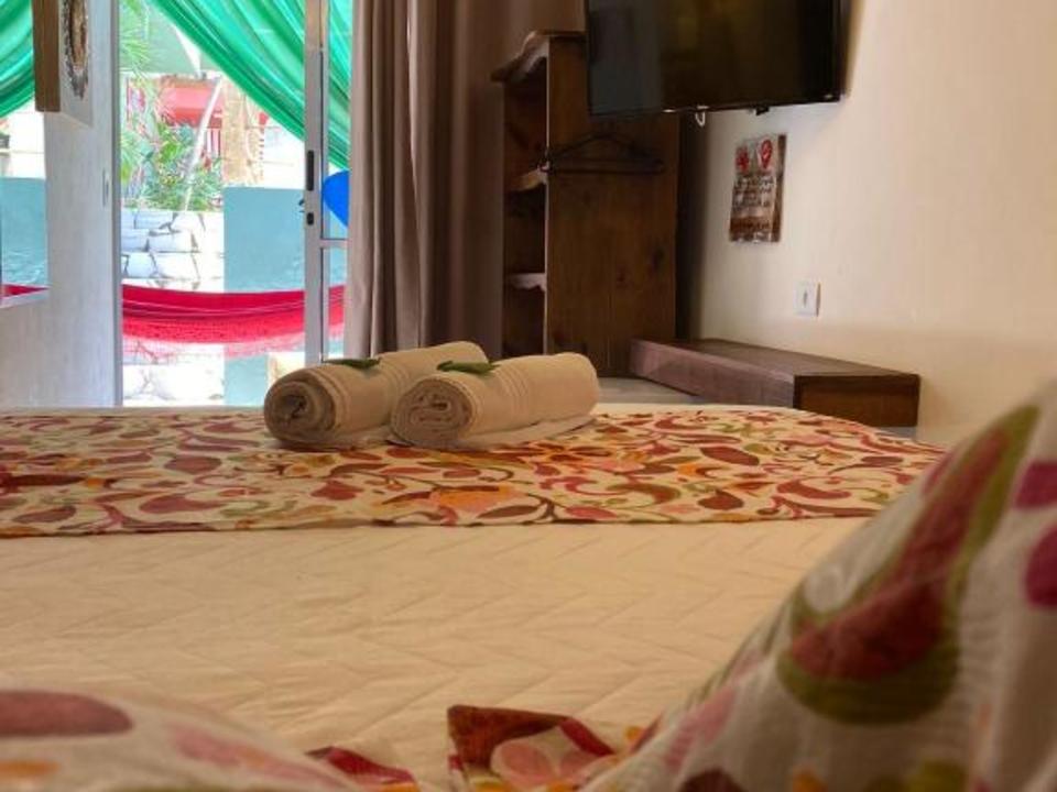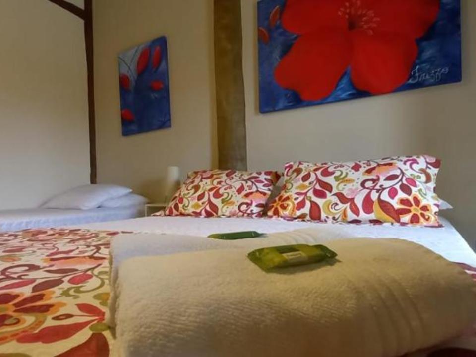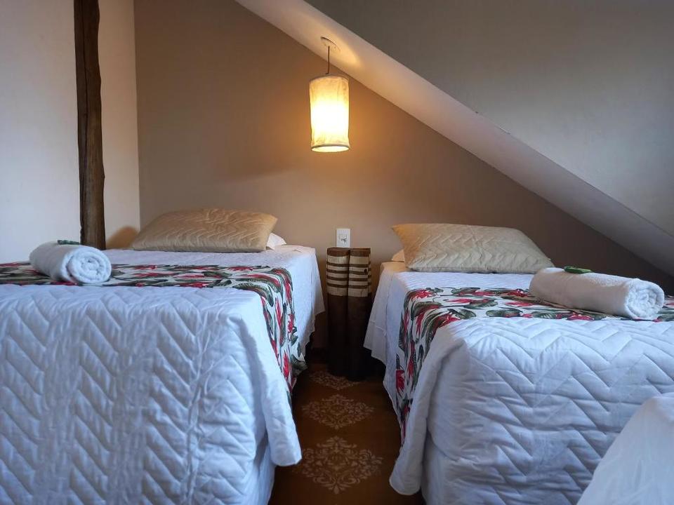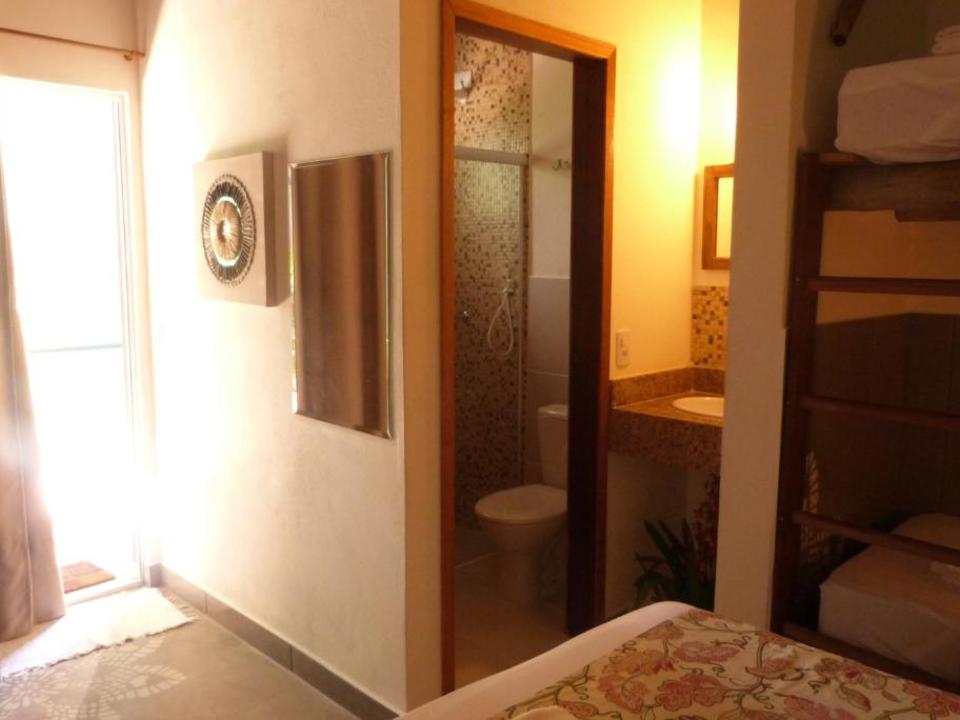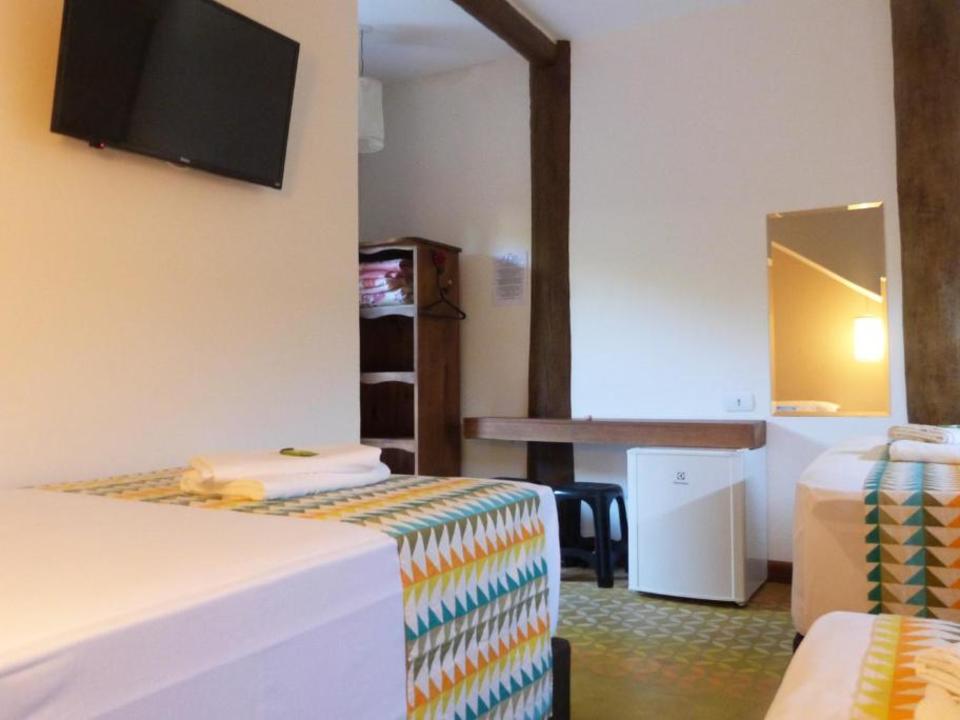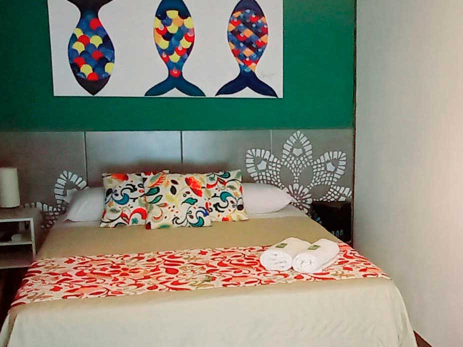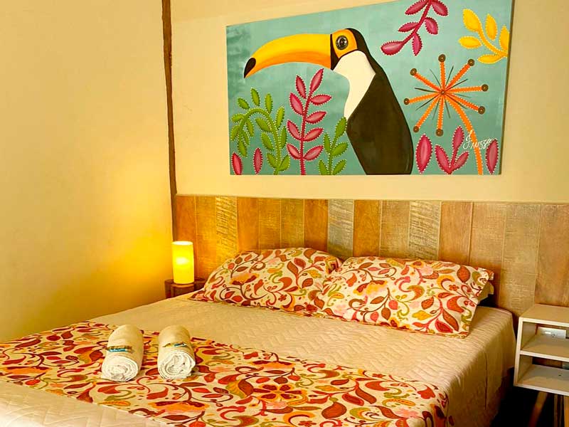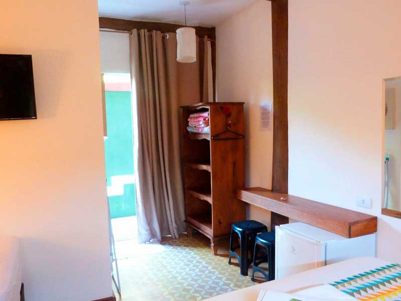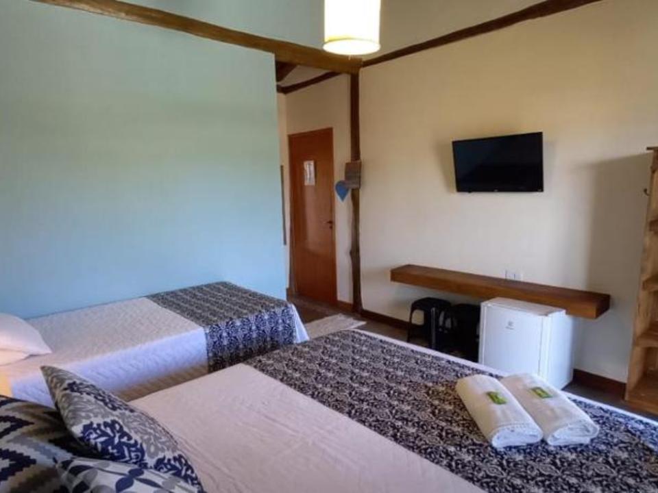 Suíte Familiar no piso térreo, o destaque desta suíte é o tamanho, ela é mais ampla que as outras e recebe crianças de todas as idades. Suíte com 1 cama de casal Queen Size, 2 camas de solteiro e uma cama auxiliar. A suíte está equipada com Ar condicionado Split Armário, Frigobar, Tv led e Varal. A suíte foi projetada para acomodar até 5 hóspedes.