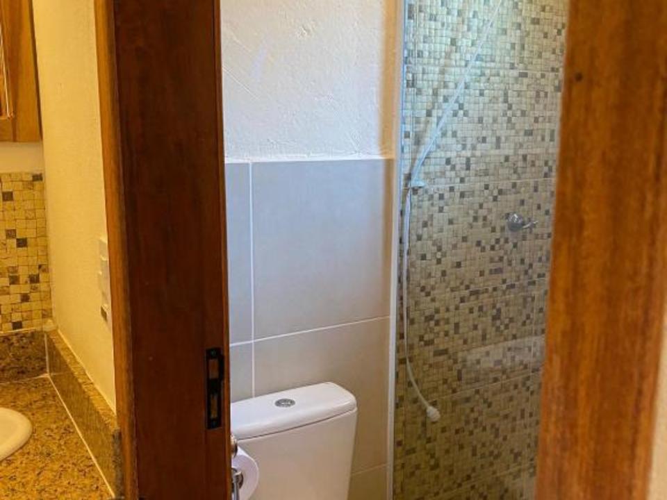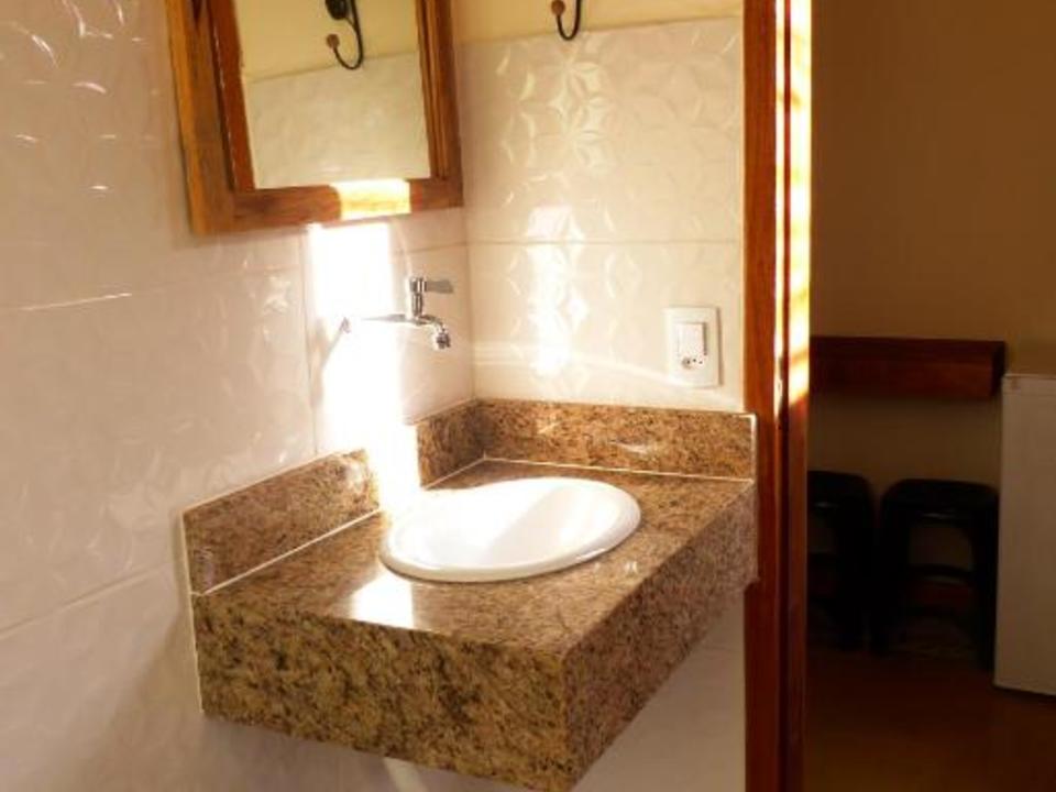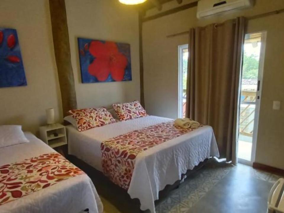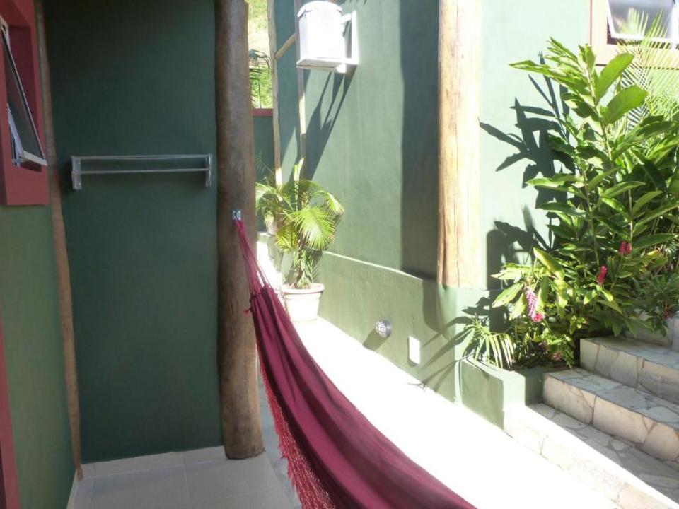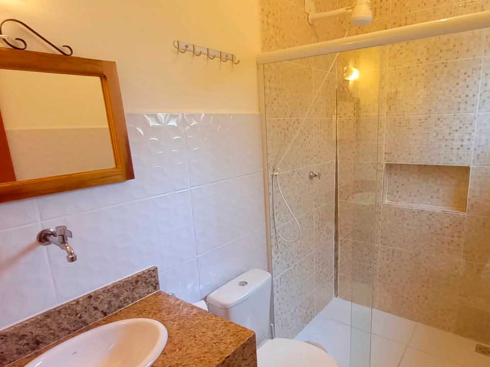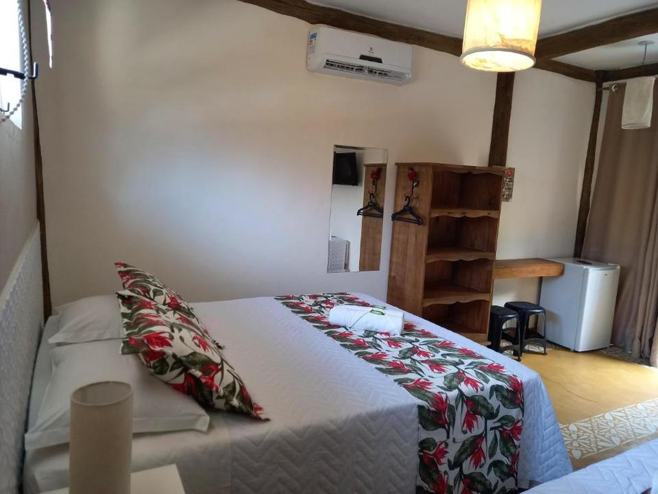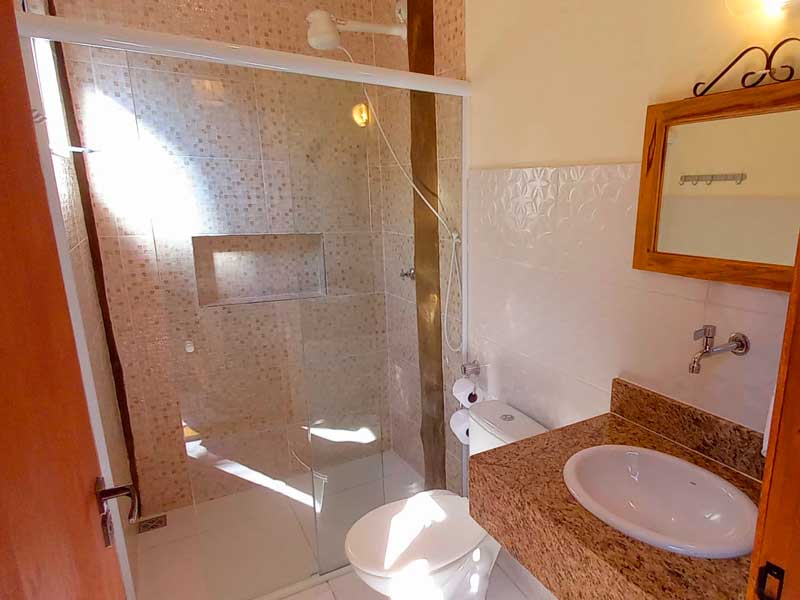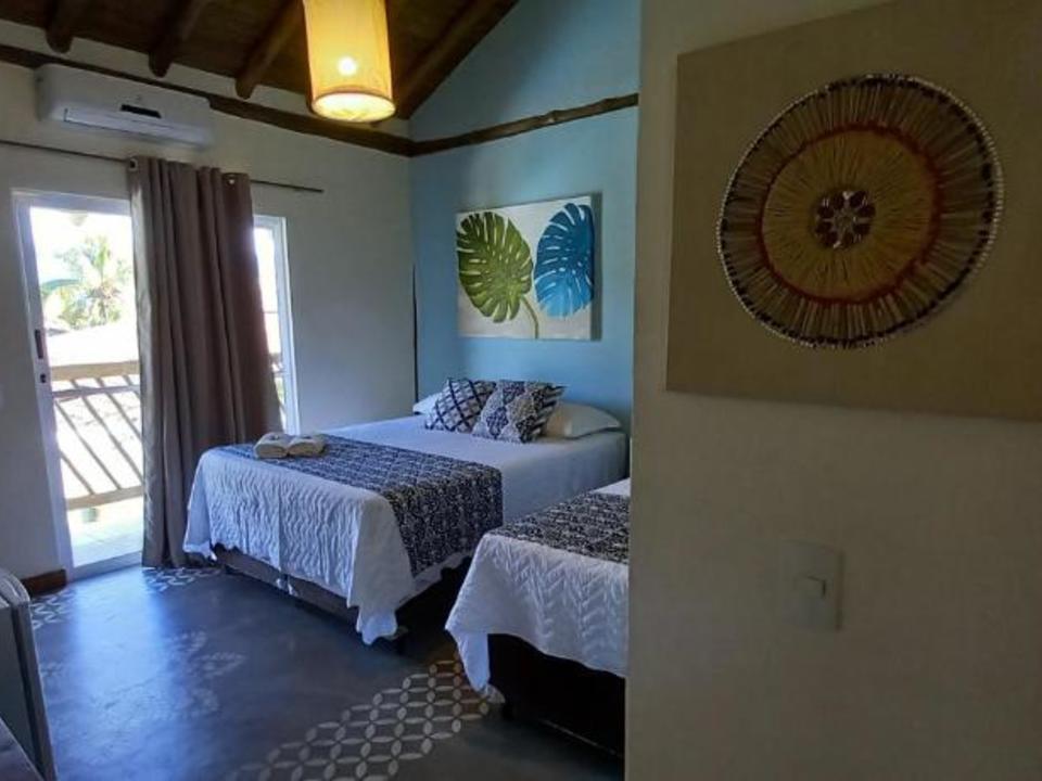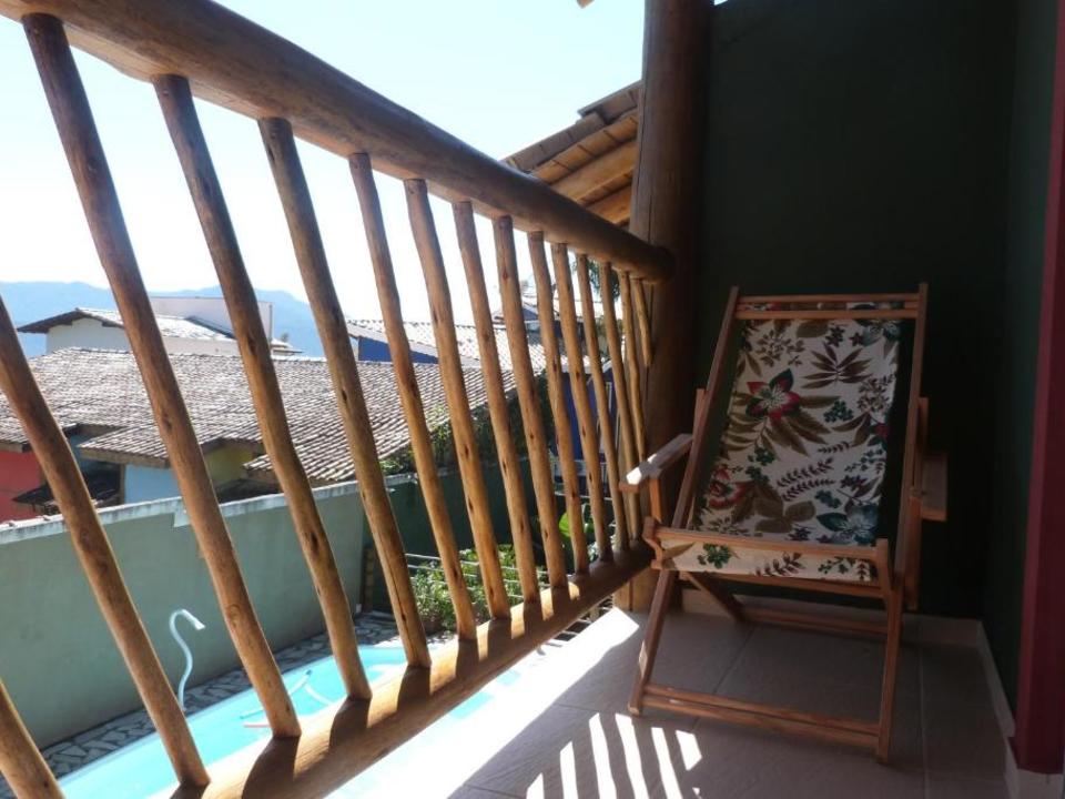 Suíte no piso superior com varanda, o destaque desta suíte é o teto todo de madeira com o pé direito alto e uma linda vista para a piscina. Suíte com 1 cama de casal Queen Size e 1 cama de solteiro. A suíte está equipada com Ar condicionado Split, Armário, Frigobar, Tv led e Varal. A suíte foi projetada para acomodar até 3 hóspedes.